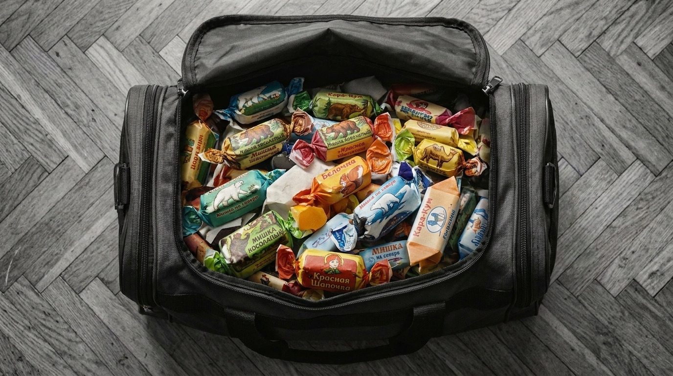 Сделали пустую сумку. Потом в отдельной генерации — «наполни этой пустой сумки советскими конфетами». С первого раза правильный размер, правильный цвет, правильные бренды (Красная Шапочка, Белочка, Кара-Кум):