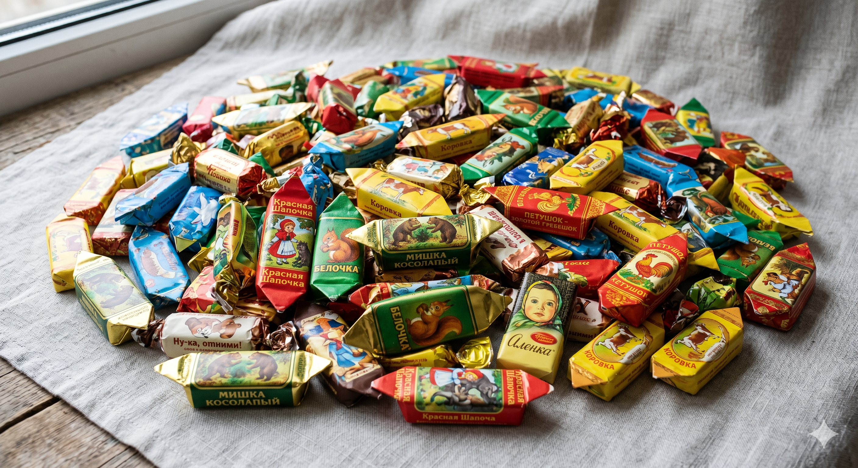 По сценарию: бандит заходит, бьёт битой тело, после третьего удара нижняя половина отрывается, изнутри сыплются цветные конфеты. candies.png — реф советских конфет: "Красная Шапочка", "Алёнка", "Ласточка", "Мишка косолапый".