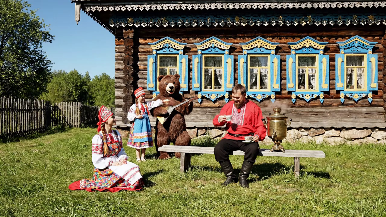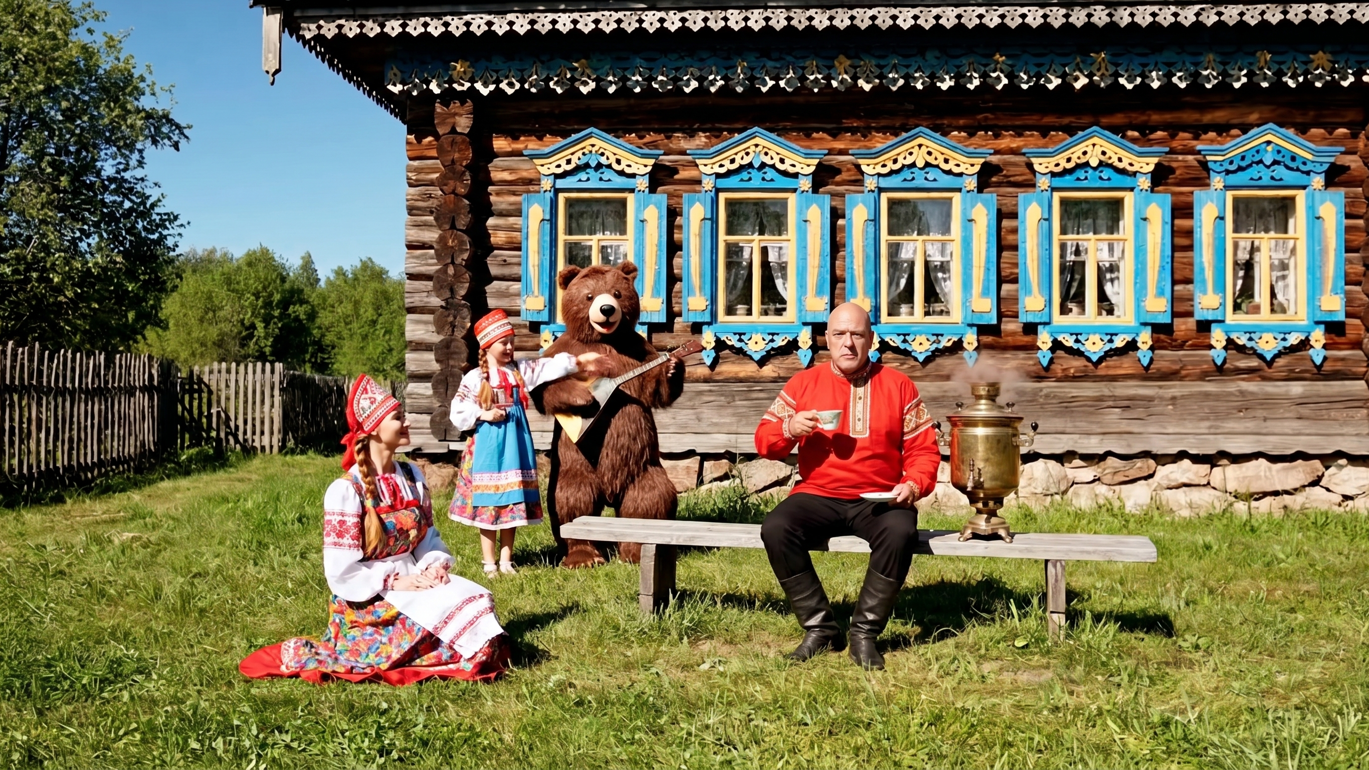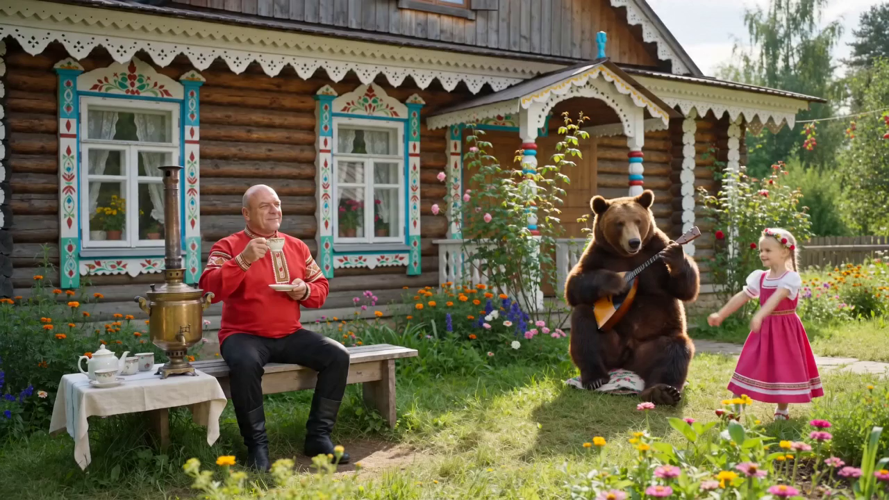Gemini пересоздал кадр в 2K — русская изба с синими наличниками, жена в сарафане и кокошнике, медведь с балалайкой, ребёнок, самовар, бандит пьёт чай: